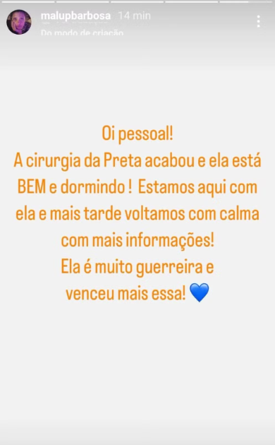A cirurgia para retirada de tumores da cantora Preta Gil iniciada na manhã da última quinta-feira, 19, foi finalizada com sucesso. A informação foi divulgada por Malu Barbosa, amiga da cantora, em uma publicação no Instagram. “A cirurgia da Preta acabou, ela está bem e dormindo”, diz o post compartilhado por volta das 6h desta sexta-feira, 20. “Ela é muito guerreira e venceu mais essa”, afirma a amiga.