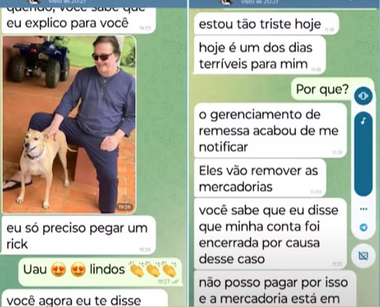 Em algumas mensagens, o homem manda fotos de Fábio Jr. em ambientes mais caseiros, para parecer que são fotos pessoais. Ele inventou a história de que suas contas foram bloqueadas devido a uma “remoção de mercadorias” do “gerenciamento de remessa”. A fã sugere que ele venda seus bens pessoais para garantir mais dinheiro, mas ele reforça que não tem acesso às suas contas.