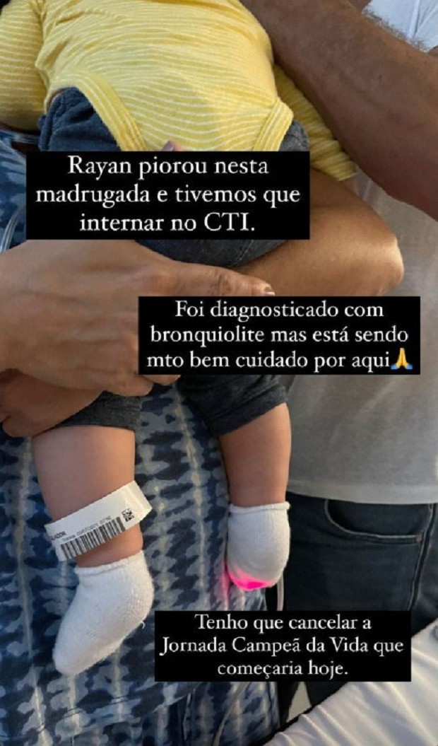 “Rayan piorou nesta madrugada e tivemos que internar no CTI”, escreveu ela, que explicou o que estava acontecendo: “Foi diagnosticado com bronquiolite, mas está sendo muito bem cuidado por aqui”. Por estar no hospital, Kyra cancelou uma live que faria no Instagram: “Vai dar tudo certo. Mas, neste momento, preciso dedicar toda a minha atenção a ele.”