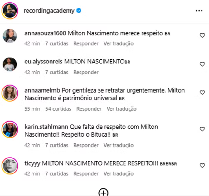 No Instagram e no X, o antigo Twitter, internautas foram aos montes protestar pelo desrespeito contra Milton. “Respeitem Milton Nascimento, p*rra”, rescreveu um. “Grammy, cadê o assunto de Milton Nascimento?!”, comentou outra. “Achou que estávamos dormindo??? Tamo, não! Respeitem o Milton Nascimento! Cadê a cadeira do maior cantor brasileiro e que está concorrendo?”, escreveu mais um.