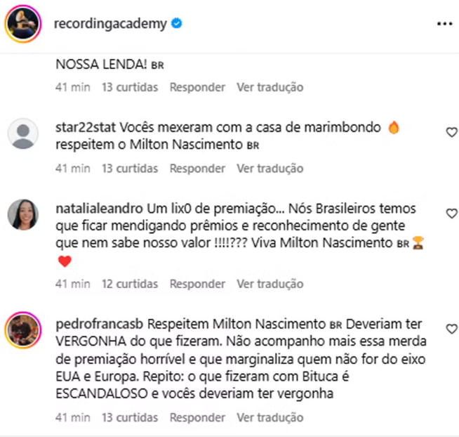 “Milton Nascimento é maior que todos os vencedores”, “quando os Estados Unidos aprenderem a respeitar a arte de Milton, talvez possam respeitar a lenda”, “é vergonhoso o que vocês fizeram com Milton Nascimento”, “fica esperto, Grammy, mexeu com o pais errado. MILTON É LENDA”, “derrubaram a cachopa de marimbondo, agora aguentem”, “absurdo o que fizeram com o MILTON NASCIMENTO!!! Ele merece muito respeito!!! Respeitem a sua história, Respeitem o nosso grande ídolo!!!” e “essa premiação serve mesmo só pra tradicional auto bajulação estadunidense né, grande surpresa… Milton merecia um lugar próprio na mesa junto com Esperanza! Mais respeito com ele, que é uma lenda viva da música, um precioso diamante pro Brasil e pro mundo!” ainda estavam entre a enxurrada de mensagens.
