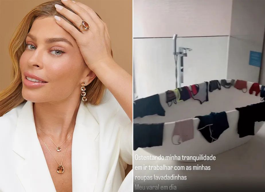 Grazi Massafera mostrou seu lado gente como a gente nesta terça-feira (22) em um vídeo postado no Instagram. A atriz, de 40 anos, improvisou um varal em sua banheira e pendurou as roupas lavadas para secar.