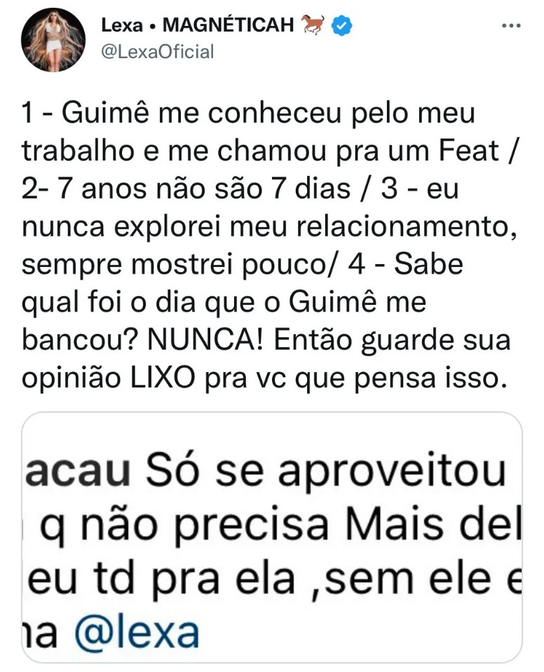 Lexa e Guimê ficaram juntos por 7 anos e anunciaram o divórcio mês passado. Em sua página no Twitter, a artista rebateu o comentário do internauta: ” Guimê me conheceu pelo meu trabalho e me chamou para um feat. 7 anos não são 7 dias. Eu nunca exporei meu relacionamento, sempre mostrei pouco”, escreveu Lexa.