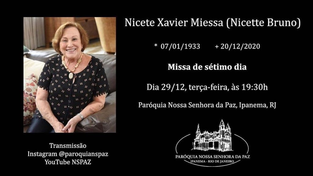 Nicette Bruno será homenageada em uma Missa de Sétimo Dia na próxima terça-feira (29). Em um convite postado ela filha da atriz, Beth Goulart, foi comunicado que a cerimônia será transmitida online pelas redes sociais da paróquia.