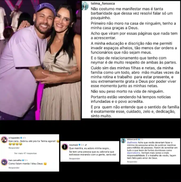 A sogra de Neymar concluiu dizendo: “Não sou peso morto na vida de ninguém. Portanto, estão vendendo há tempos notícias infundadas e o povo acredita. E pra quem não entende que o sentido de família é exatamente esse, cuidado, zelo e, dedicação, sinto muito”.