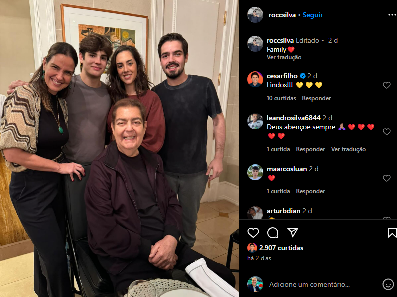 O apresentador Fausto Silva não tem aparecido muito nas redes sociais nos últimos meses por questões de saúde. Em uma rara aparição desde seu transplante de rim, há quatro meses, ele posou em uma foto que seu filho caçula, Rodrigo, publicou no Instagram. O registro foi compartilhado no domingo (23/6).