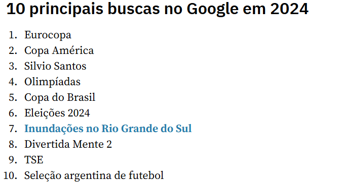 Segundo a empresa, o principal destaque foi a Eurocopa, que liderou o ranking das buscas no país, seguida pela Copa América. No terceiro lugar, aparece o apresentador Silvio Santos.