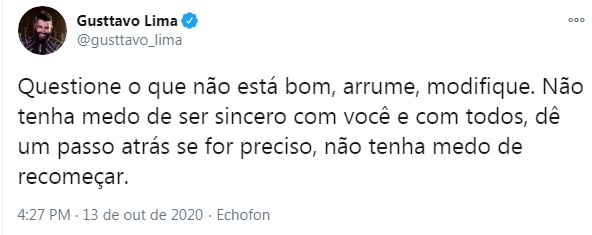 E nesta terça-feira, o cantor usou o Twitter para falar sobre “reparar os erros” num post. “Questione o que não está bom, arrume, modifique. Não tenha medo de ser sincero com você e com todos, dê um passo atrás se for preciso, não tenha medo de recomeçar. Vai doer, mas é preciso. Olhe no espelho e seja sincero com você, diga, em alto e bom som, o que sente na alma e no coração. Pergunte a si mesmo se está feliz”, dizia o texto que Gusttavo fez em seu perfil oficial, referindo-se ao fim do casamento de cinco anos com a modelo.