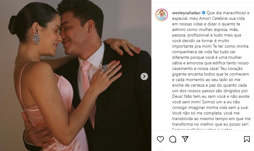 Safadão escreveu um texto para a mulher nas redes sociais, com direito a elogios e declarações de amor. “Que dia maravilhoso e especial, meu amor! Celebrar sua vida em nossas vidas e dizer o quanto te admiro como mulher, esposa, mãe, pessoa, profissional e tudo mais que você decidir se tornar é muito importante pra mim! Te ter como minha companheira de vida faz tudo ser diferente porque você é uma mulher sábia e amorosa, que edifica tanto nosso casamento e nossa casa!”, escreveu o cantor.