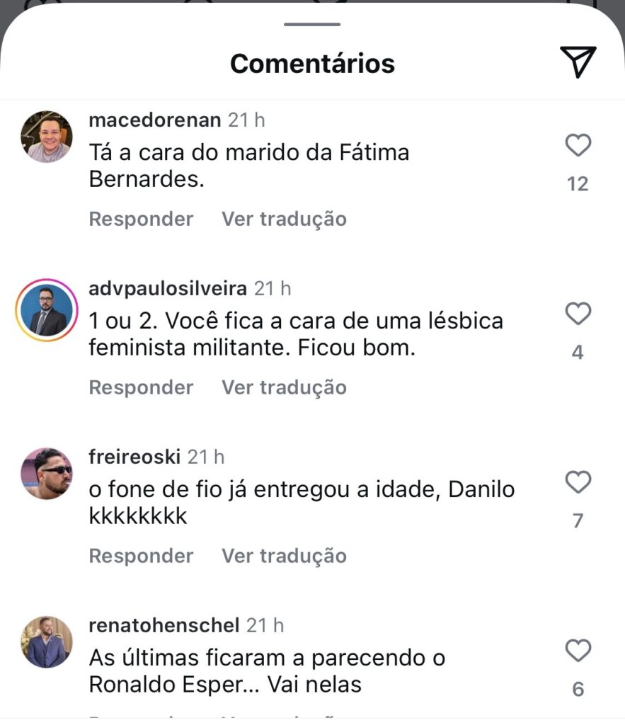 Nos comentários, muitos não gostaram de nenhuma das opções escolhidas pelo apresentador. “Tá a cara do marido da Fátima Bernardes”, disse um. Algumas mulheres, aproveitaram para elogiar Danilo: “Vi um vídeo seu do CQC hoje e o que chamou a atenção é que você não envelheceu nada”.
