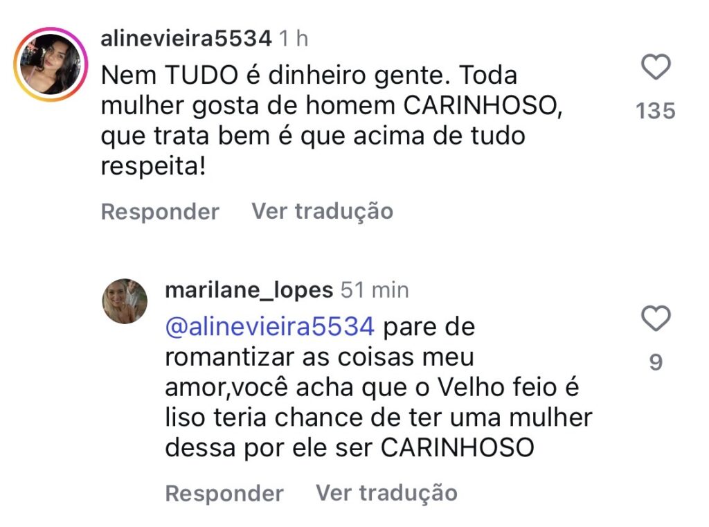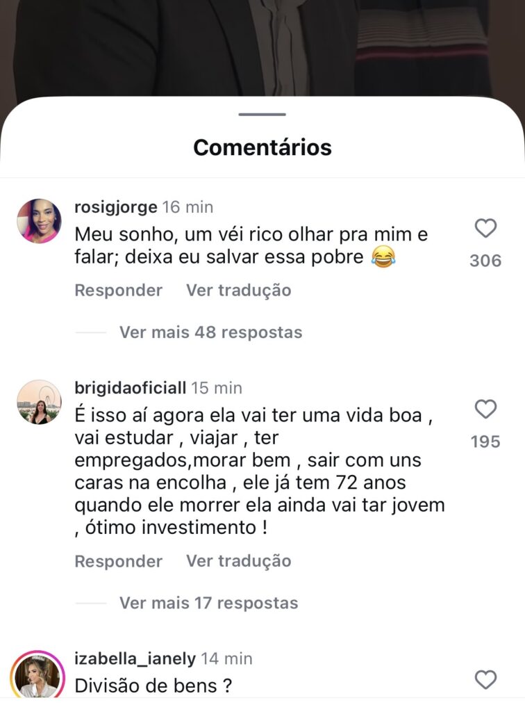A noiva, 51 anos mais jovem, não deixou de registrar nenhum momento do dia especial. Através dos stories do Instagram, a Miss Universe Mato Grosso 2024 mostrou desde a maquiagem e cabelo até o momento da oficialização da união. Mas parece que essa união deixou alguns internautas intrigados. Tudo por causa da grande diferença de idade entre os dois. Os comentários nas redes sociais da miss foram bastante ofensivos e sempre relacionados com o fato que a moça teria se casado com o cantor devido a situação financeira privilegiada de Amado Batista. “Meu sonho, um véio rico olhar pra mim e falar; deixa eu salvar essa pobre.”, disse uma internauta. “Ta certo moça não te julgo, ser CLT tá muito difícil. Tá perdoada”, disse outra. Veja os comentários abaixo: