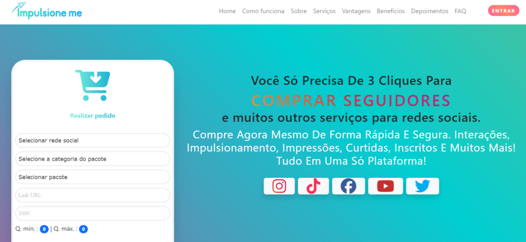 Impulsione Me é a plataforma que ocupa o segundo lugar na nossa lista. Utilizá-la é fácil, e existe a possibilidade de comprar seguidores no Instagram mas, também, em outras redes. Facebook, Youtube, Tik Tok e Kwai são algumas das redes que contam com pacotes disponíveis para compra em Impulsione Me.