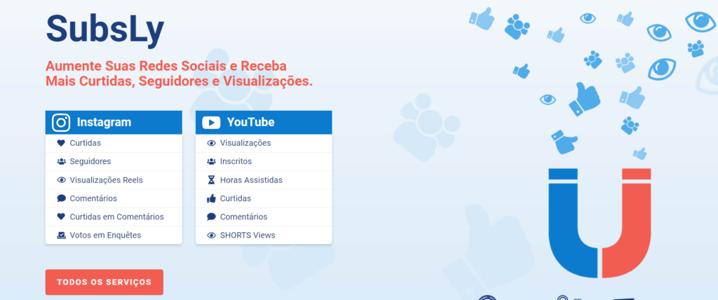 Ocupando o primeiro lugar na nossa lista está a Subsly. Subsly é uma empresa que oferece o serviço de compra de seguidores para o Instagram, mas também conta com a compra de outras interações e followers para outras redes sociais. Youtube, Kwai e Twitter, ou X, são as redes que contam com pacotes disponíveis para compra em Subsly.