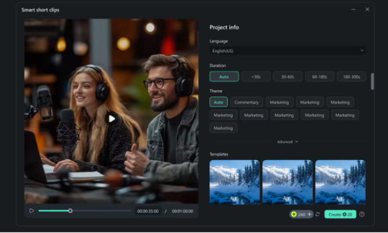 Entre os recursos mais complexos e que merecem destaque estão os clipes curtos inteligentes, cortes de cena, aprimorador de vídeo, rastreamento planar, linha de tempo magnética, auto reframe, compactação avançada, tradutor de vídeo, trajetória de movimento e uma dezena de outras funções.