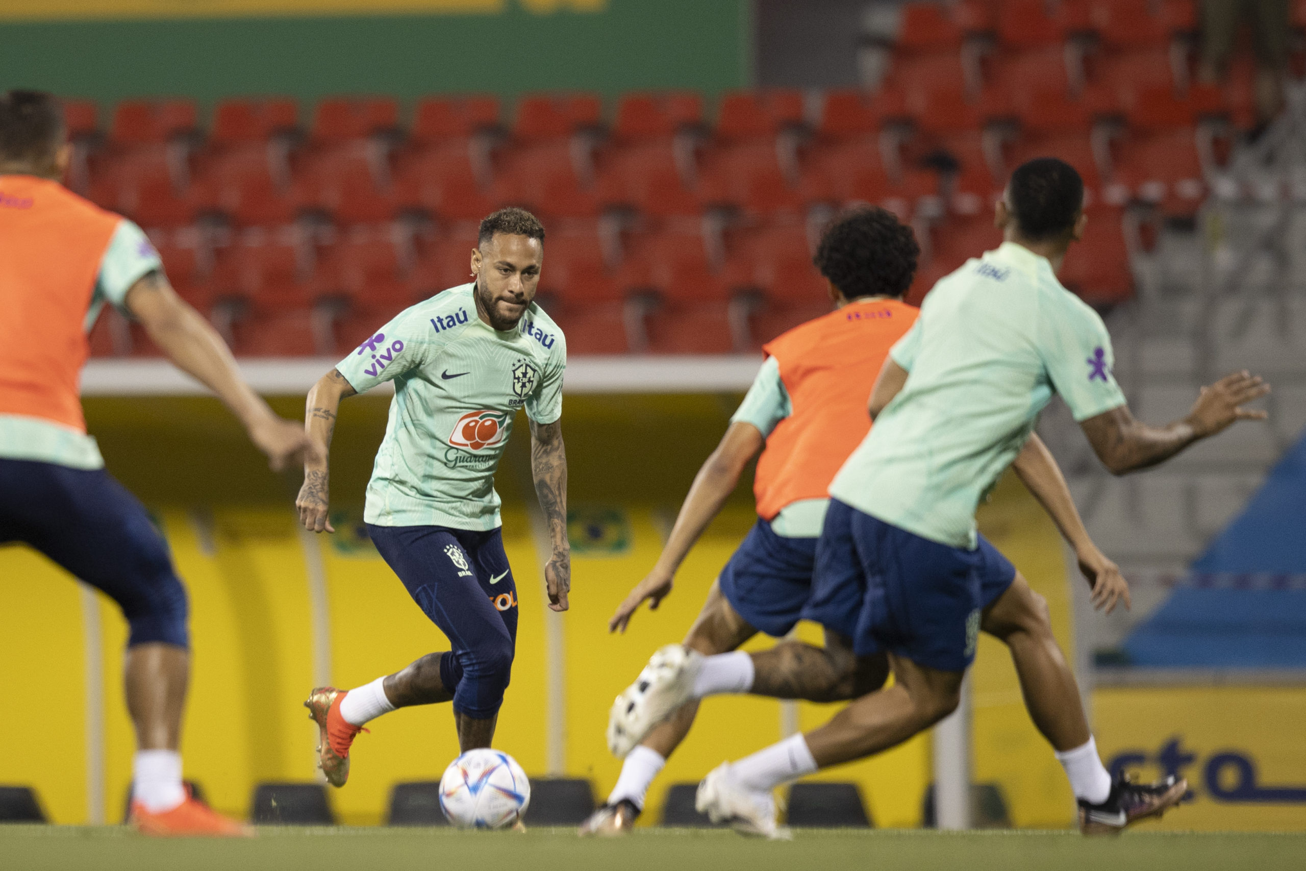 Após uma semana de treinamentos no CT da Juventus, na Itália, a seleção brasileira realizou a primeira atividade no Catar, país sede da Copa do Mundo. No estádio Gran Hammad, o técnico Tite comandou trabalhos específicos focados nos posicionamentos dos setores ofensivos e defensivos.