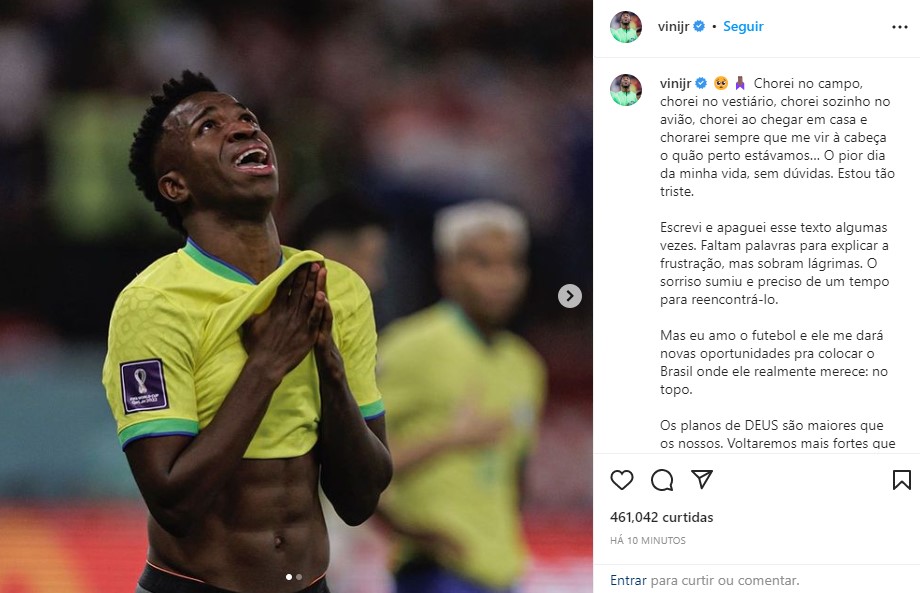 Após sua primeira participação em Copa do Mundo, Vini Jr postou um desabafo nas redes sociais após a eliminação diante da Croácia nas quartas de final do torneio. O atacante pediu desculpas pelo resultado negativo e prometeu voltar mais forte em 2026. “Brasil, mil Desculpas. Falhamos no momento importante e os decepcionamos, perdão” – disse.