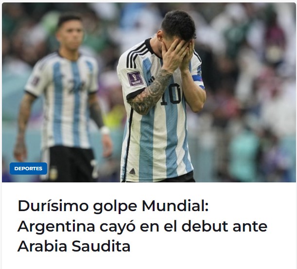 O amargo resultado da estreia da Argentina na Copa do Mundo repercutiu nos jornais locais como um ‘duro golpe’ sofrido pela equipe treinada por Lionel Scaloni. Veículos tradicionais como o ‘Olé’, ‘Clarin’ e ‘La Prensa’ deram destaque para a derrota por 2 a 1 diante da Arábia Saudita, que representou a perda da invencibilidade de 36 jogos dos ‘hermanos’.