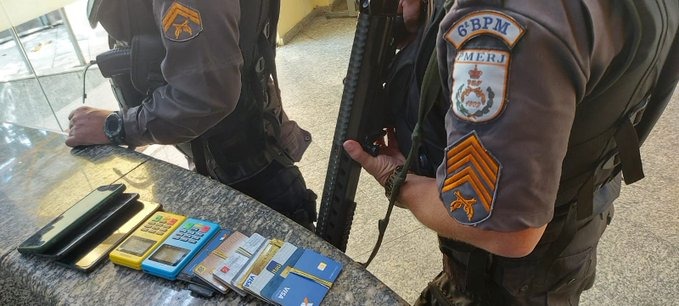 Com os estelionatários os agentes apreenderam cartões de crédito, máquinas de cartão e celulares – Foto: Divulgação/PMERJ