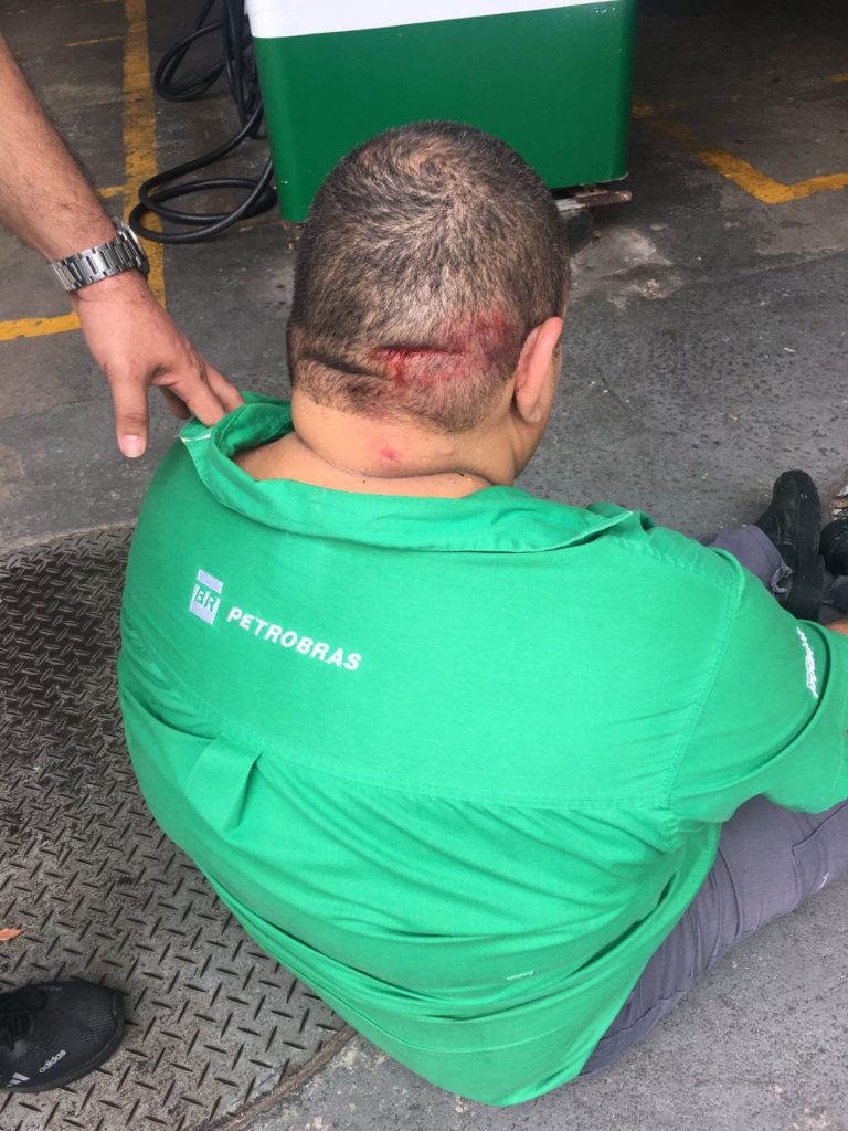 O frentista Marcius de Lima Santana que trabalha em um posto de combustível, localizado na Praça Cardeal Arcoverde, em Copacabana, foi agredido à pauladas, por um homem alcoolizado que queria usar o banheiro do estabelecimento.