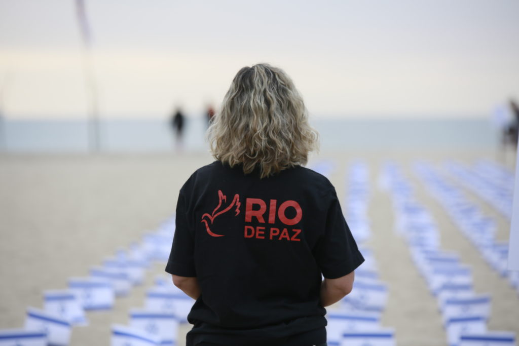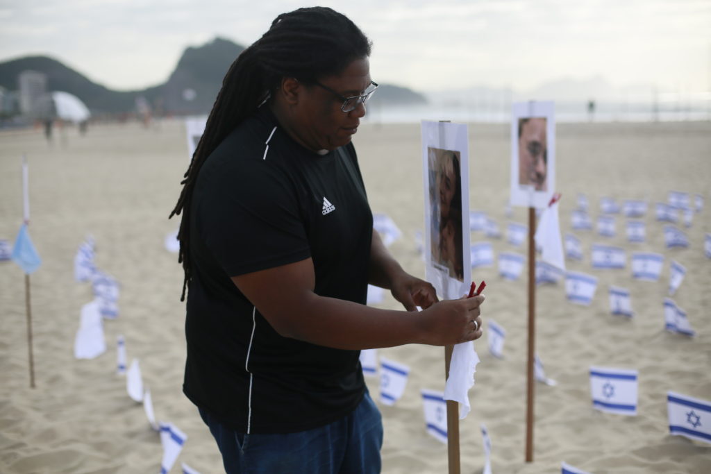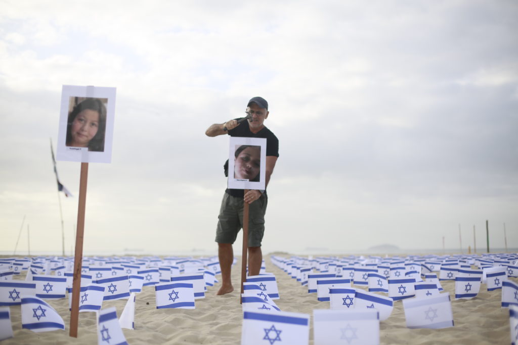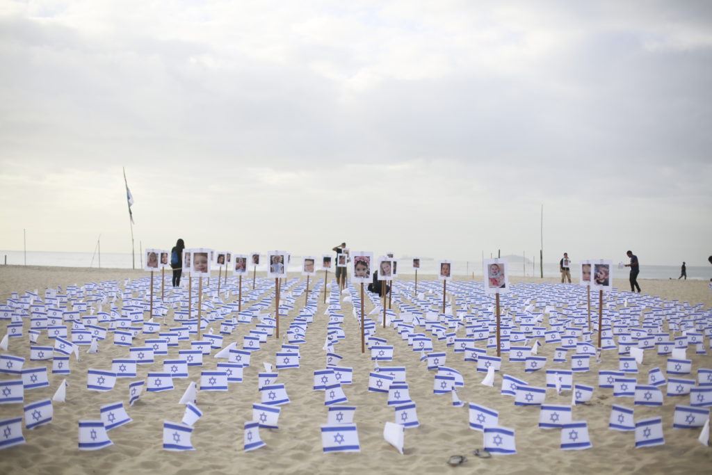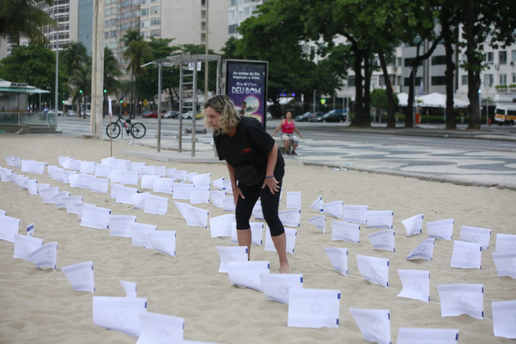 O ato pelas vítimas israelenses aconteceu em frente ao Copacabana Palace. Na areia da praia foram espalhadas 1.400 bandeiras de Israel e fotos de crianças sequestradas.