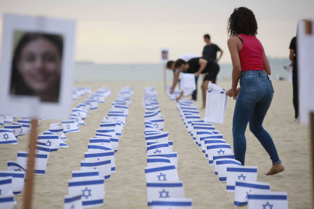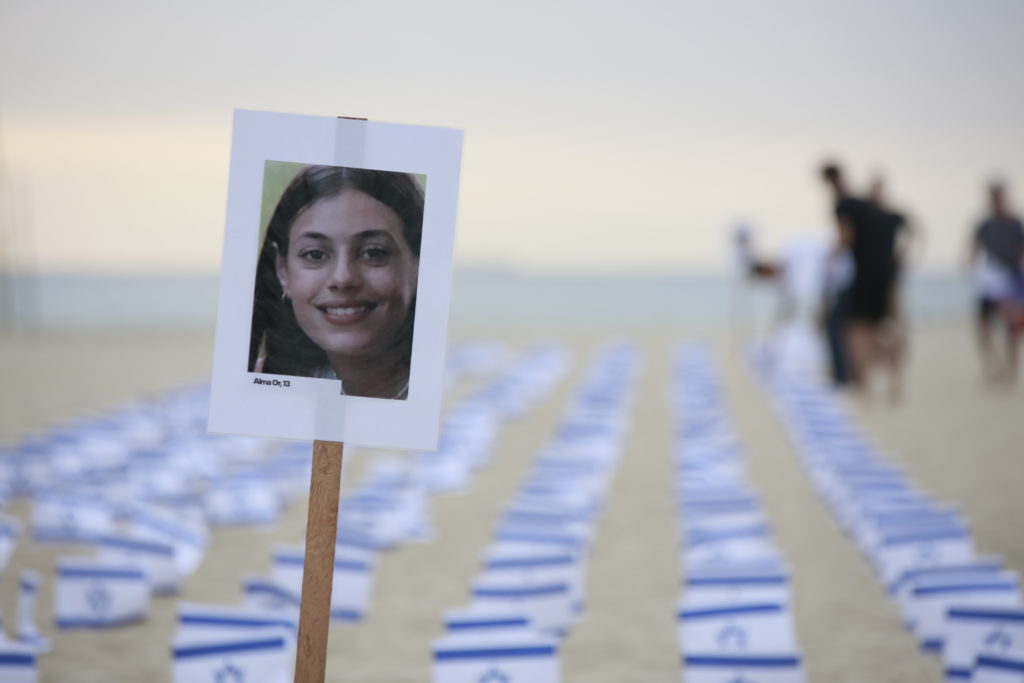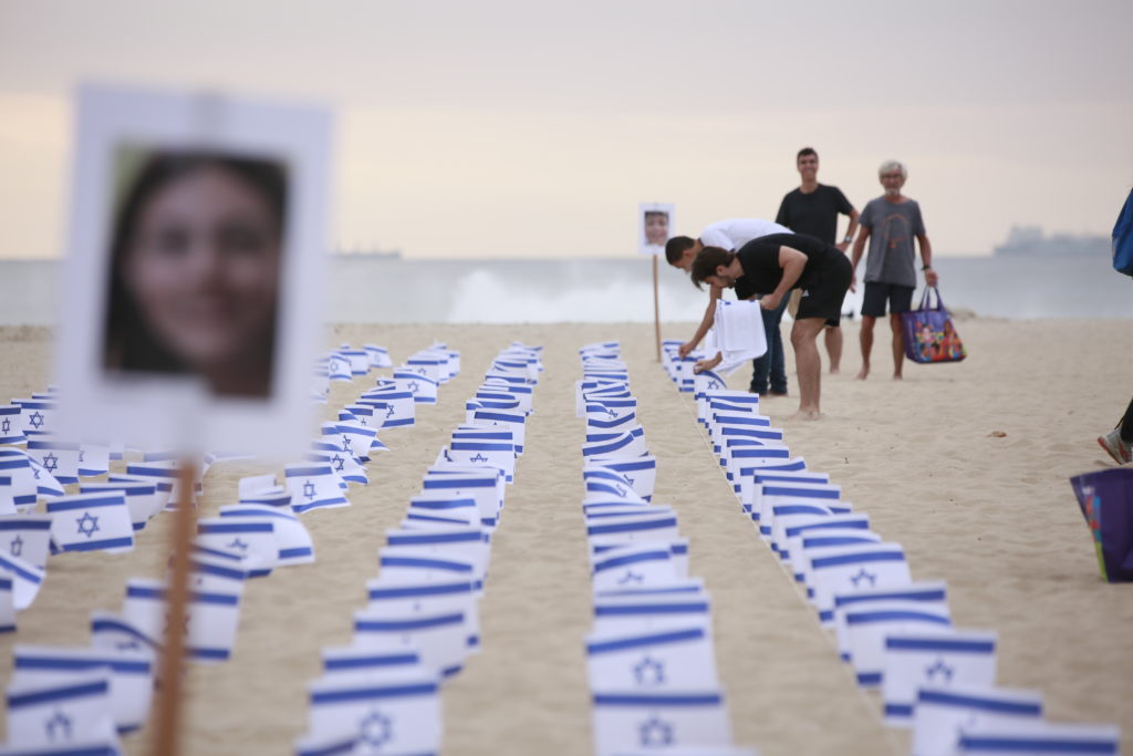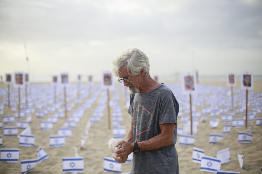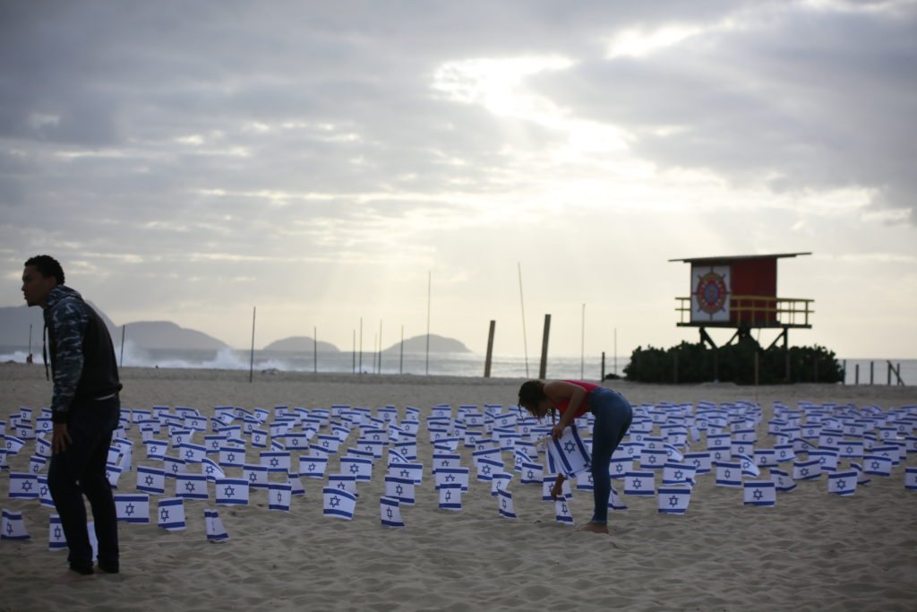 O ato pelas vítimas israelenses aconteceu em frente ao Copacabana Palace. Na areia da praia foram espalhadas 1.400 bandeiras de Israel e fotos de crianças sequestradas.