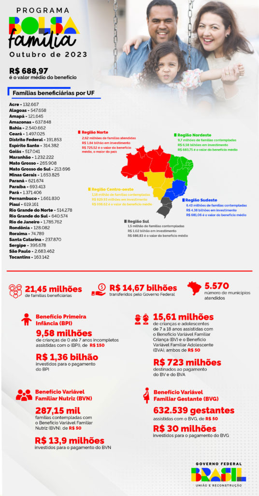 BVN — Em todo o país, 21,45 milhões de famílias serão contempladas nos 5.570 municípios brasileiros. O valor médio do benefício pago em todo o país é de R$ 688,97 e supera em 0,30% o de setembro (R$ 686,89).