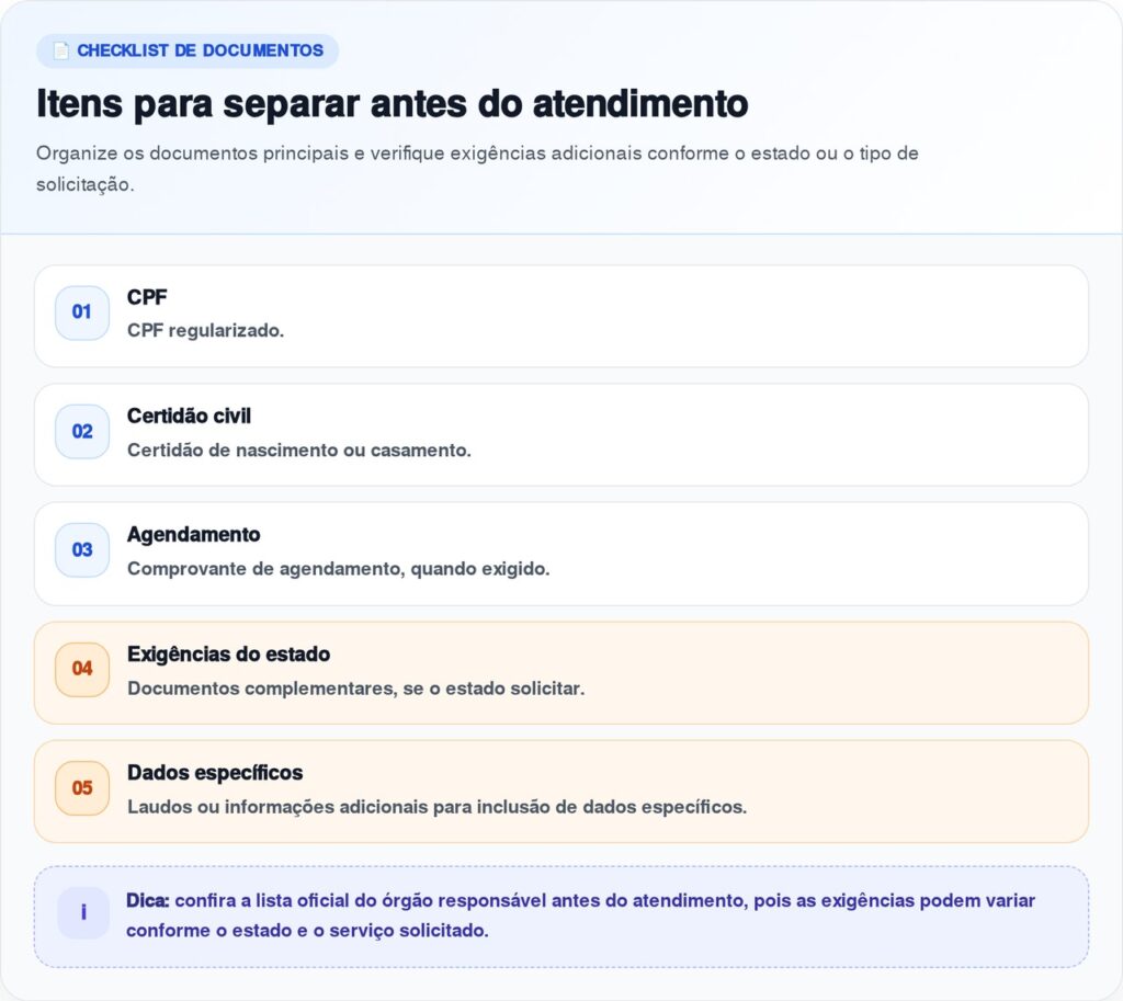 Antes de sair de casa, vale conferir a lista atualizada no site oficial do estado. Isso evita perder o atendimento por falta de documento, divergência no nome, dados desatualizados ou ausência de certidão correta.