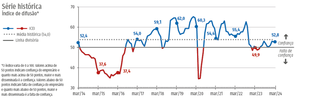 Em março de 2024, o Índice de Confiança do Empresário Industrial (ICEI) se manteve praticamente estável, com uma variação de 0,1 ponto para 52,8 pontos, frente aos 52,7 pontos registrados em fevereiro de 2024. O índice permanece acima da linha divisória dos 50 pontos e, portanto, segue indicando que o setor industrial está confiante.