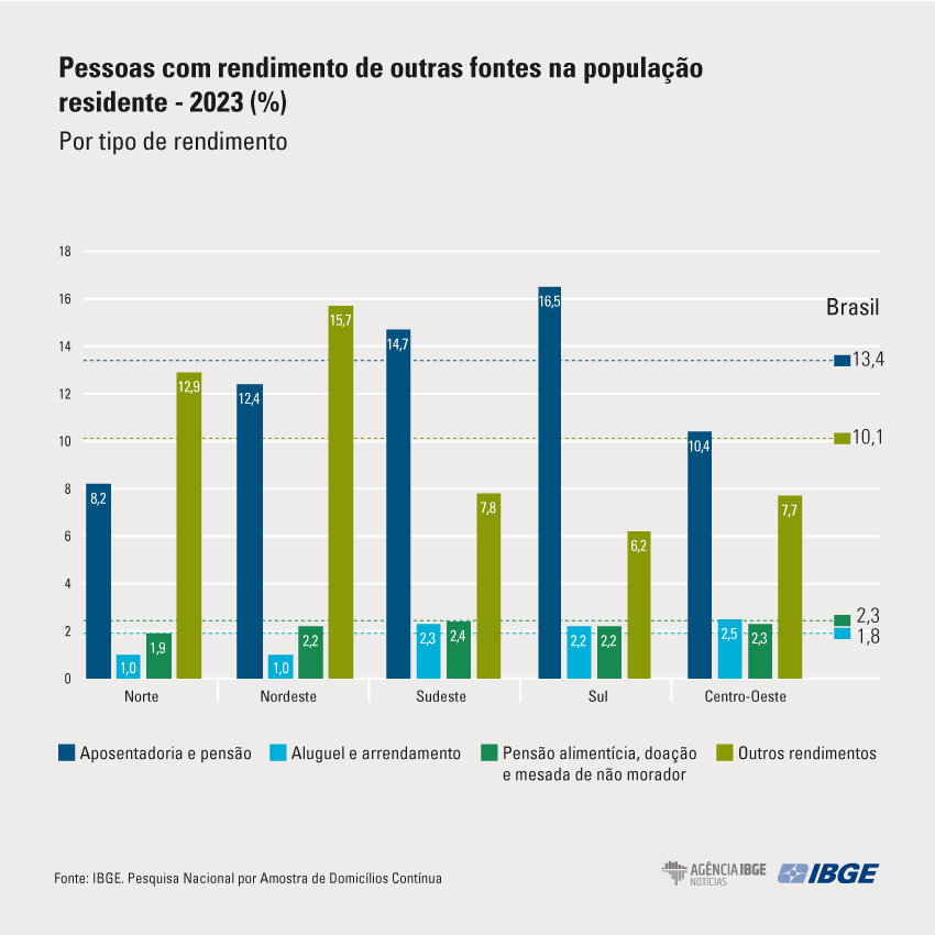 Esses indicadores consideram todas as origens de rendimento, ou seja, além dos provenientes do trabalho, há a categoria outras fontes, que é composta por aposentadoria e pensão, aluguel e arrendamento, pensão alimentícia, doação e mesada de não morador e outros rendimentos. Os dados fazem parte do módulo Rendimento de todas as fontes, da Pnad Contínua, e foram divulgados, nesta sexta-feira (19), pelo IBGE.