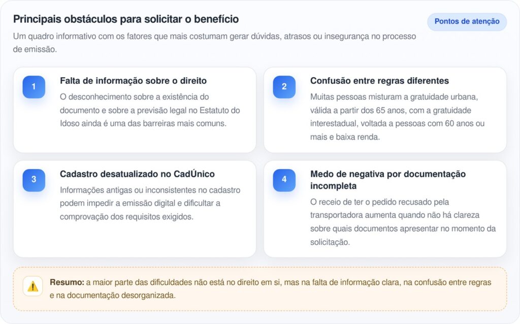 A falta de informação é o principal obstáculo. Muitos brasileiros acima de 60 anos sequer sabem que a Carteira do Idoso existe ou confundem as regras do transporte interestadual com as do transporte urbano. Outros desistem por imaginar que o processo é burocrático. Na prática, as barreiras mais comuns incluem: