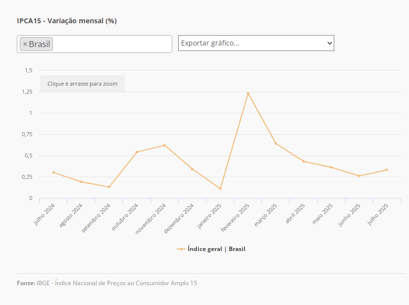 A prévia da inflação de julho apresentou alta de 0,33%, após o índice de 0,26% registrado em junho. O Índice Nacional de Preços ao Consumidor Amplo 15 (IPCA-15), a inflação oficial do país, foi divulgado nesta sexta-feira,(25), pelo IBGE, e aponta que a maior variação e o maior impacto positivo vieram do grupo Habitação, com 0,98% e 0,15 p.p., respectivamente. No ano, o IPCA-15 acumula alta de 3,40% e, nos últimos 12 meses, a variação foi de 5,30%, acima dos 5,27% observados nos 12 meses imediatamente anteriores. Em julho de 2024, a taxa havia sido de 0,30%.