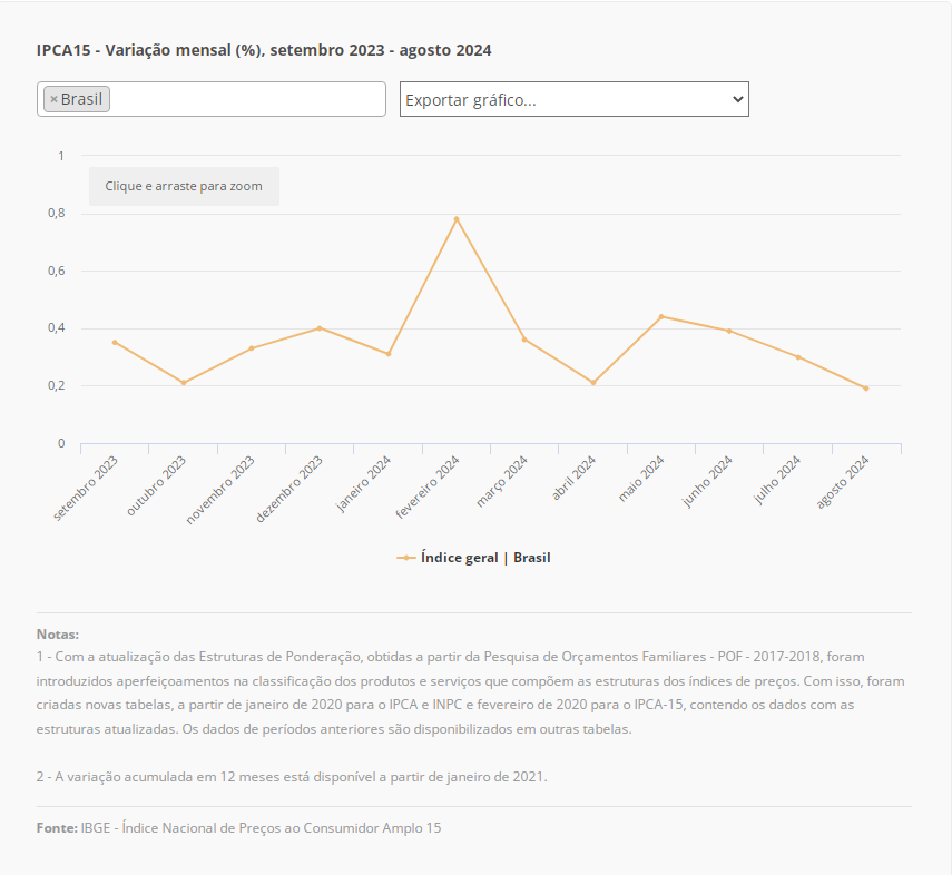 Nos últimos 12 meses, a variação do IPCA-15 foi de 4,35%, abaixo dos 4,45% observados nos 12 meses imediatamente anteriores. Em agosto de 2023, a taxa foi de 0,28%.