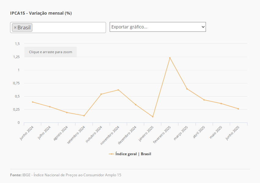 O IPCA-E, acumulado trimestral do IPCA-15, ficou em 1,05%, próximo à taxa de 1,04% registrada no mesmo período do ano passado. Nos últimos 12 meses, IPCA-15 acumulou alta de 5,27%, abaixo dos 5,40% observados nos 12 meses imediatamente anteriores. Em junho de 2024, a taxa foi de 0,39%.