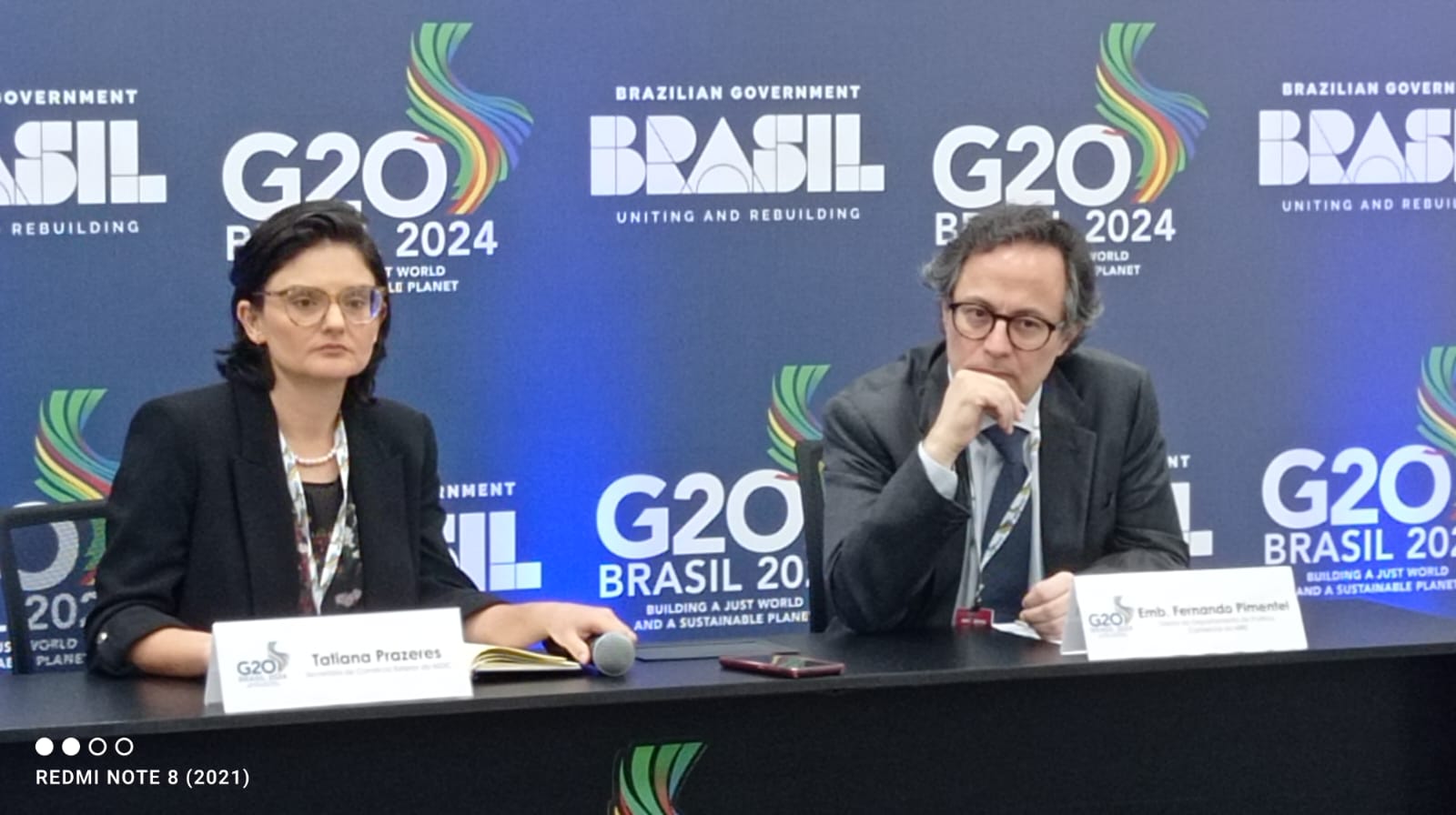Foi realizada, na Praça 15, no Centro do Rio, durante 2 dias, a 3ª Reunião do Grupo de Trabalho de Comércio e Investimentos do G20. A Secretária de Comércio Exterior do Ministério da Indústria, Comércio e Serviços, Tatiana Prazeres, e o embaixador Fernando Pimentel, Diretor do Departamento de Política Comercial do Ministério de Relações Exteriores, concederam entrevista coletiva após a reunião desta sexta-feira, e explicaram que foram discutidos comércio e desenvolvimento sustentável em acordo de investimento e reforma da Organização Mundial do Comércio (OMC), no contexto da governança Globo.