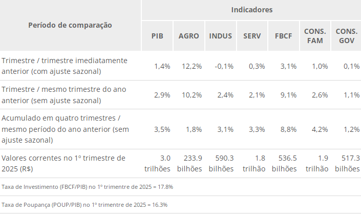 O PIB totalizou R$ 3,0 trilhões no primeiro trimestre de 2025, sendo R$ 2,6 trilhões referentes ao Valor Adicionado a preços básicos e R$ 431,1 bilhões, aos Impostos sobre Produtos líquidos de Subsídios. No mesmo período, a taxa de investimento foi de 17,8% do PIB, acima dos 16,7% do primeiro trimestre de 2024. Já a taxa de poupança foi de 16,3%, superando os 15,5% do mesmo trimestre de 2024.
