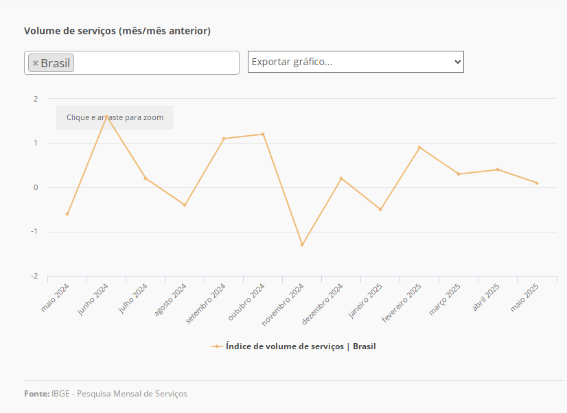 No acumulado de janeiro a maio deste ano, o volume de serviços teve expansão de 2,5% em relação ao mesmo período de 2024. Já o acumulado nos últimos 12 meses, ao avançar 3,0% em maio de 2025, acelerou o ritmo de crescimento frente ao observado em abril de 2025 (2,7%).