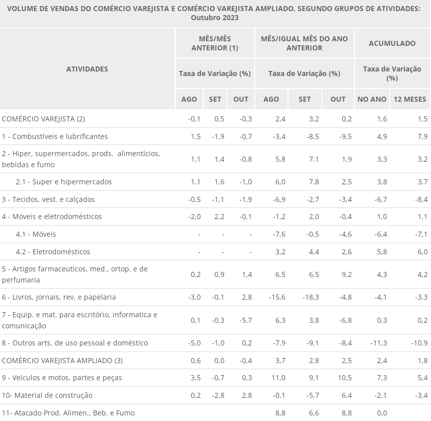 A variação de -0,3% no volume de vendas do comércio varejista na passagem de setembro para outubro de 2023, na série com ajuste sazonal, teve predominância de taxas negativas, atingindo cinco das oito atividades pesquisadas: Equipamentos e material para escritório, informática e comunicação (-5,7%), Tecidos, vestuário e calçados (-1,9%), Hiper, supermercados, produtos alimentícios, bebidas e fumo (-0,8%), Combustíveis e lubrificantes (-0,7%) e Móveis e eletrodomésticos (-0,1%).
