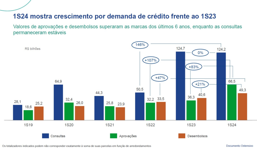 Já o resultado operacional apontou que as aprovações de crédito, no 1º semestre de 2024, superaram as marcas dos últimos 6 anos, somando R$ 64,9 bilhões (aumento de 79% em relação ao mesmo período de 2023). Os desembolsos do BNDES, que totalizaram R$ 49,3 bilhões no 1º semestre de 2024, mantêm uma trajetória de crescimento, com um aumento de 21% frente ao mesmo período de 2023.