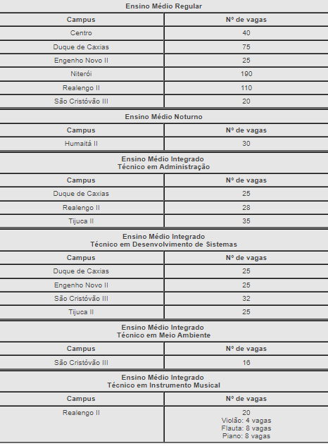 Para o Ensino Médio, são 721 vagas distribuídas entre os cursos regular, noturno e integrado. Candidatos ao ensino médio integrado podem optar entre os cursos técnicos em Administração, Desenvolvimento de Sistemas, Meio Ambiente e Instrumento Musical (modalidade Piano, Violão ou Flauta Transversal).