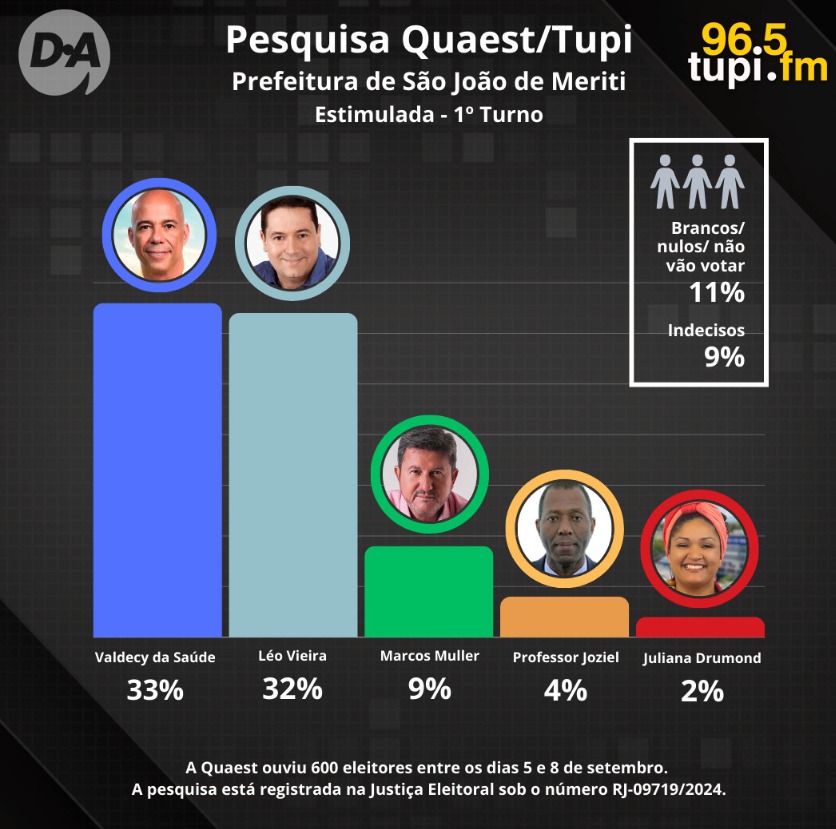 Pesquisa realizada pelo Instituto Quaest divulgada nesta terça-feira (10) revela os principais cenários da corrida eleitoral para a Prefeitura de São João de Meriti, na Baixada Fluminense. No cenário estimulado, quando os nomes dos candidatos são apresentados aos eleitores, o deputado estadual Valdecy da Saúde (PL) atinge 33% das intenções de voto, empatado tecnicamente com o também deputado estadual Léo Vieira (Republicanos), com 32%.