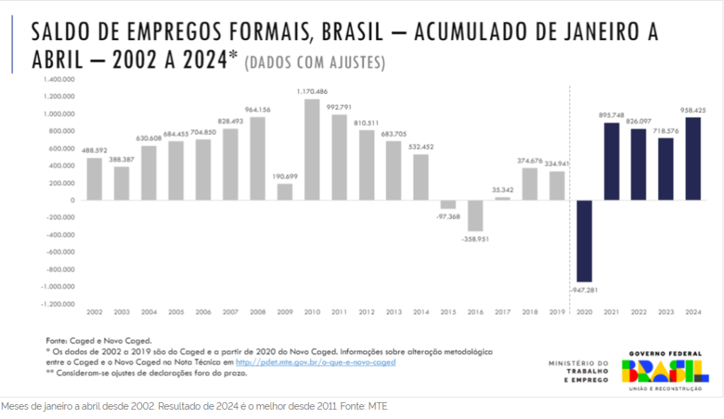 Nos quatro meses de 2024, o acumulado é de 958.425 postos de trabalho, o melhor resultado desde 2011, com saldo positivo nos cinco grandes grupamentos econômicos e em 26 das 27 Unidades da Federação. Considerando os últimos 12 meses, a geração alcança 1,7 milhões de postos formais.