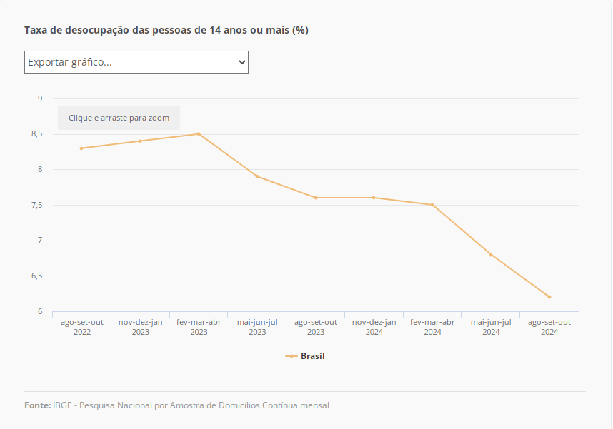 A PNAD Contínua de agosto a outubro de 2024 trouxe a menor taxa de desocupação entre os 152 trimestres móveis que compõem a série histórica, iniciada em janeiro / março de 2012: 6,2% da força de trabalho do país, o equivalente a 6,8 milhões de pessoas em busca de emprego. Este, por sua vez, foi o menor número de pessoas desocupadas em uma década ou, mais precisamente, desde o trimestre encerrado em dezembro de 2014. Os dados foram divulgados nesta sexta-feira pelo Instituto Brasileiro de Geografia e Estatística (IBGE).
