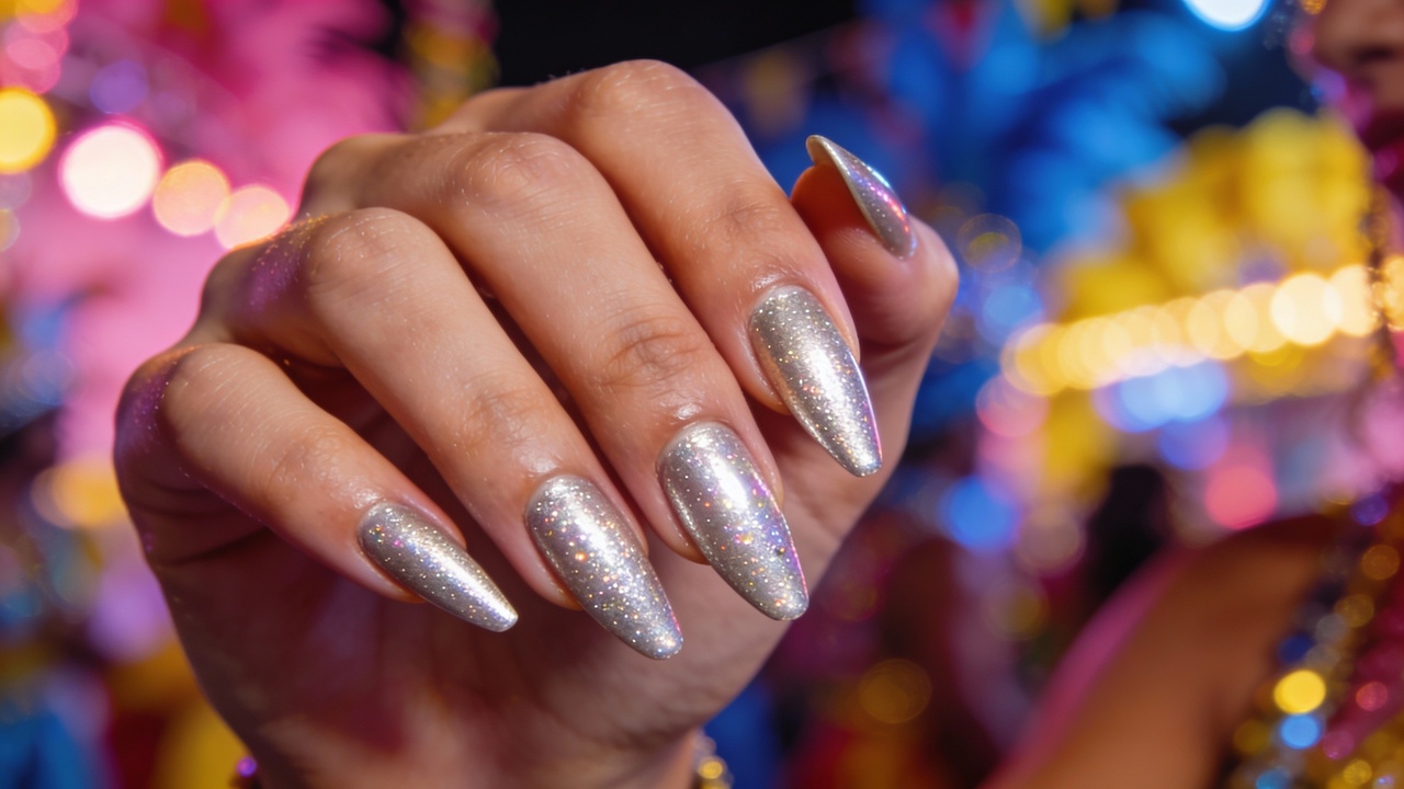 Esmaltes cintilantes oferecem brilho controlado e fácil combinação. Cores como prata, rosé, dourado e azul-claro alongam visualmente as mãos e mantêm um ar elegante, mesmo em meio à folia.