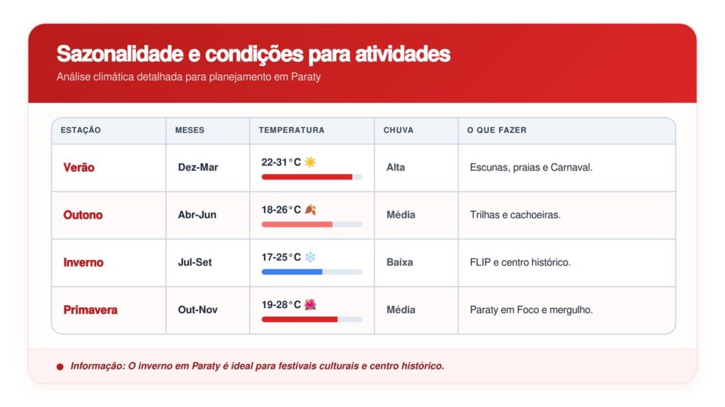 Paraty tem clima tropical úmido, com chuvas concentradas no verão. O inverno seco é a melhor época para o centro histórico e trilhas. O verão favorece escunas e mergulho, mas exige tolerância às pancadas de chuva no fim da tarde.