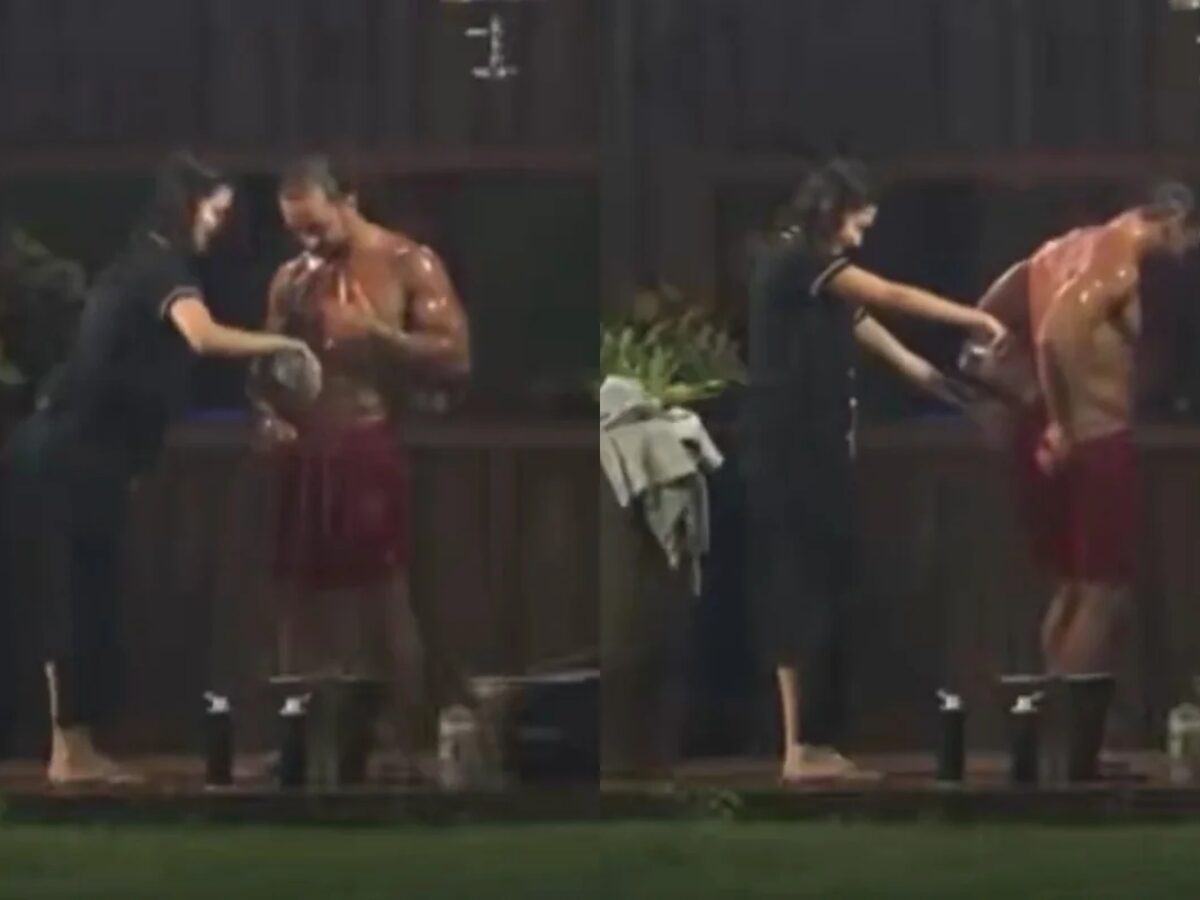 Enquanto aplicava água sobre Mesquita, Duda aproveitou para conferir algumas partes do corpo do atleta, filho do apresentador Otávio Mesquita. “Tem que esfregar aqui”, disse a ex-atriz, provocando risadas dos presentes. Próximos à cena, Saory Cardoso e Dudu Camargo não se conteram: “Vamos, Dudu. Agora eu também quero te banhar! A bunda dele!”, comentou Saory, enquanto Duda reagia: “Imagina minha mãe vendo isso?”