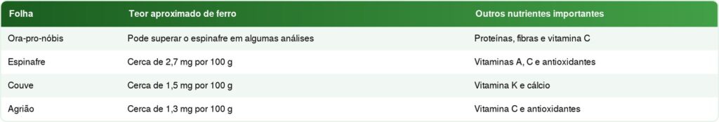 Comparação nutricional entre folhas ricas em ferro