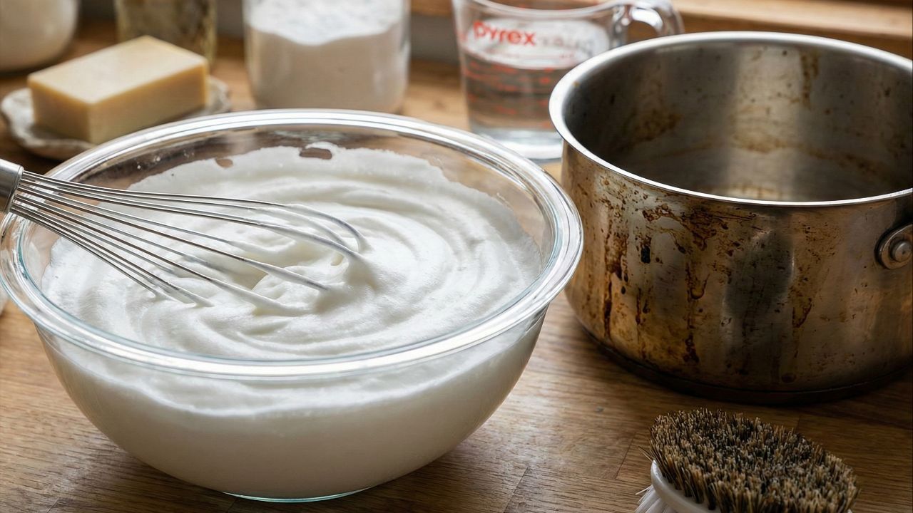 A chamada espuma de limpar panela é uma mistura caseira preparada para remover gordura pesada e manchas escuras do fundo e das laterais. Em geral, a receita leva algum tipo de sabão, água quente e ingredientes que reforçam o poder desengordurante, resultando em um produto espesso, parecido com uma cobertura cremosa.