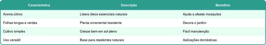 Por esse motivo, a citronela é considerada uma planta aromática com efeito repelente natural. Embora não elimine completamente os insetos, ela ajuda a reduzir a presença de mosquitos quando cultivada no ambiente.