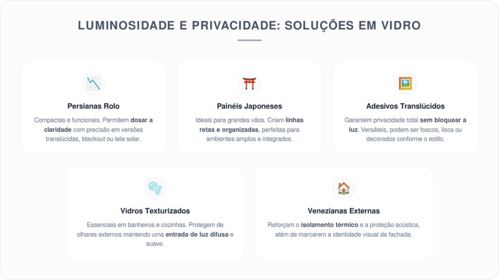Ao dizer “adeus às cortinas”, é fundamental considerar o impacto sobre a luz natural, já que telas solares, vinilos translúcidos e vidros esmerilados modulam a claridade de maneiras diferentes, permitindo calibrar o tipo de iluminação desejada em cada cômodo.