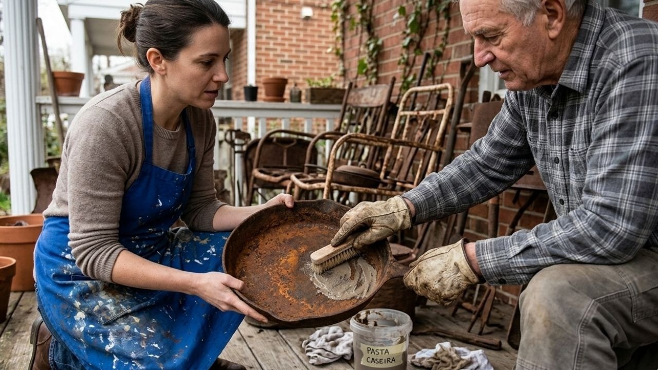 Para ferramentas muito enferrujadas, uma combinação de sal grosso, vinagre e bicarbonato pode ser a solução. A mistura gera uma reação química que dissolve a oxidação. Após a aplicação, esfregue o local com palha de aço para finalizar o processo.